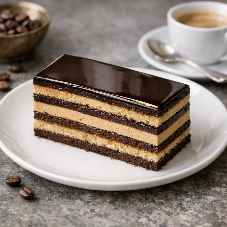 Des couches précises de biscuit aux amandes, sirop café, crème au beurre café et ganache chocolat, recouvertes d'un glaçage net. Élégant, intense et d'une sophistication très parisienne.