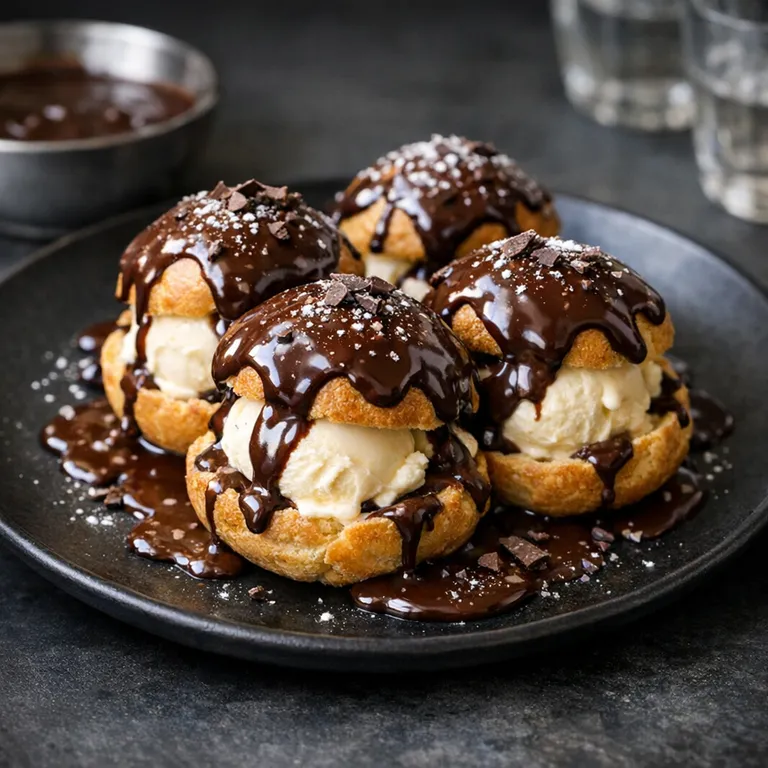 Coupez les choux en deux, garnissez-les de glace vanille et nappez de sauce au chocolat chaude. Servez immédiatement.