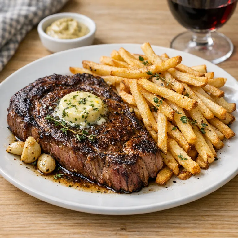 Un grand classique de brasserie: un steak saisi avec une belle croûte, servi avec des frites dorées et croustillantes, et juste assez de beurre pour rendre l’ensemble irrésistible.