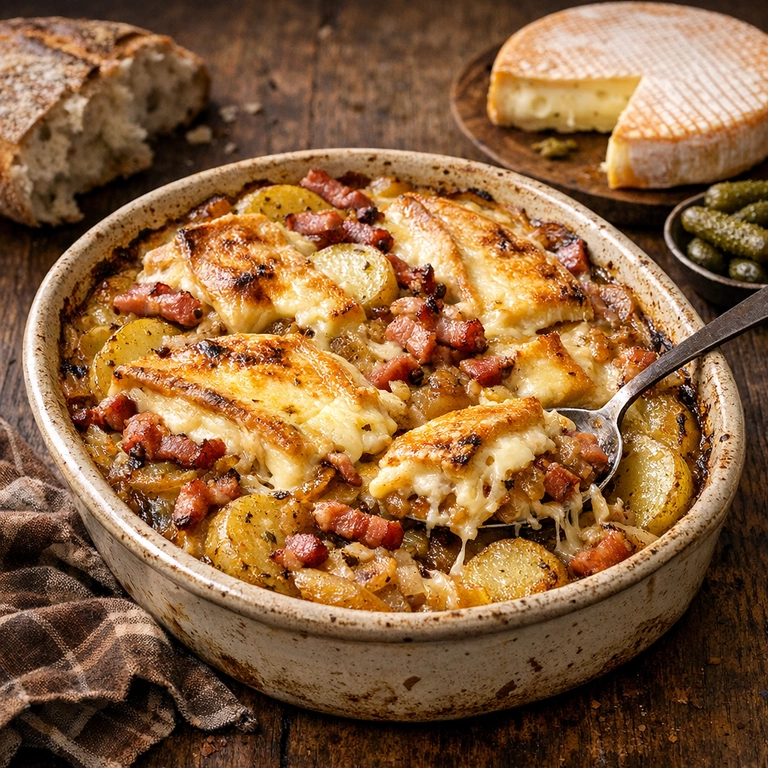 Des pommes de terre fondantes, des lardons dorés, des oignons doucement compotés et un reblochon coulant forment ce grand classique alpin, généreux et irrésistiblement convivial.