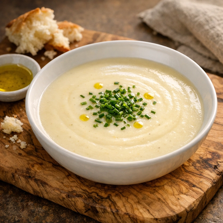 Une soupe froide soyeuse de poireaux et pommes de terre, enrichie de crème et finie avec de la ciboulette fraîche. Élégante, douce et parfaitement française dans son raffinement.